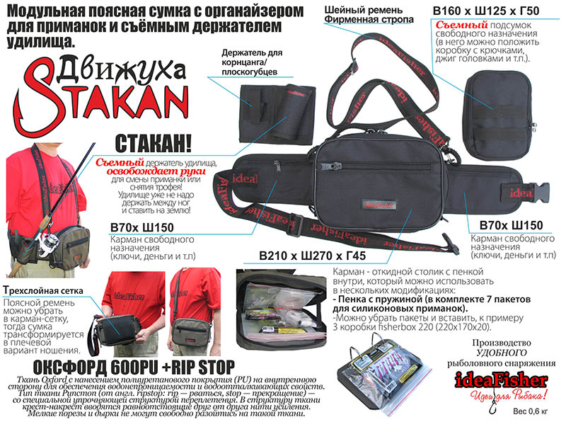 Первая «фишка» сумки - съемный модуль держатель удилища Stakan ZERO, с помощью которой можно надежно зафиксировать удилище на поясе и освободить руки для снятия трофея, смены приманки, перекура или просто насладиться красотой вокруг! Свободные руки позволяют БЫСТРО сменить приманку! Следовательно, у вас больше ВРЕМЕНИ для рыбалки!